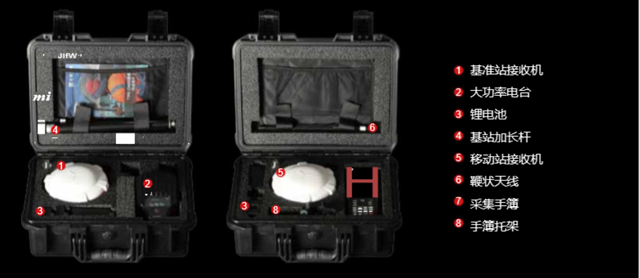 1 基準站接收機,2大功率電臺,3 鋰電池, 4基站加長桿