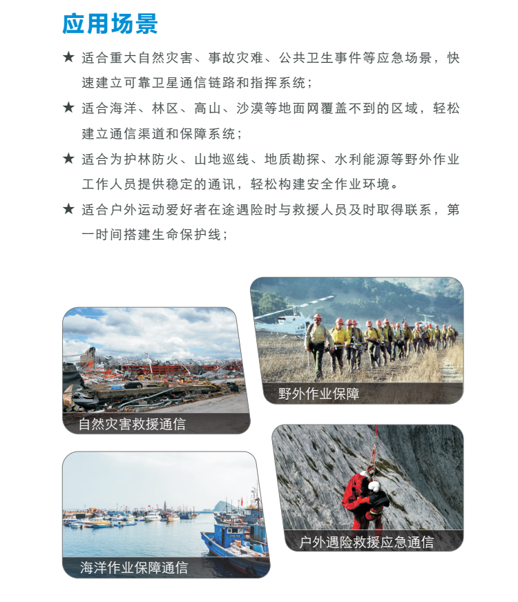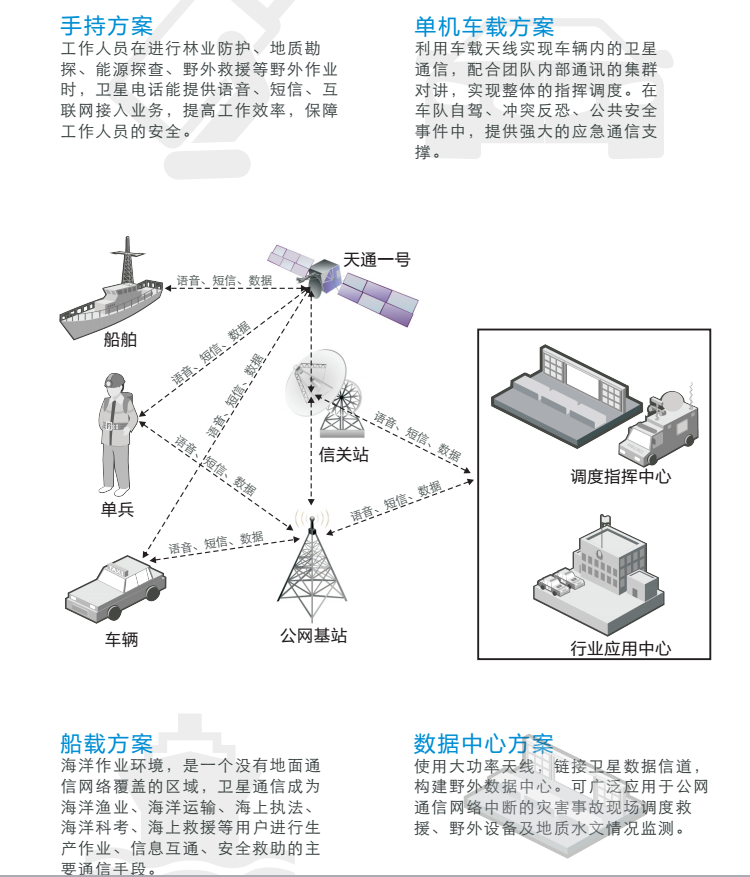 能夠支持保密的語(yǔ)音通信、數(shù)據(jù)傳輸和視頻會(huì)議,能夠?qū)崿F(xiàn)災(zāi)難救援、海上救助和偏遠(yuǎn)地帶救援,可以開展遠(yuǎn)程教育、遠(yuǎn)程醫(yī)療、廣播和直播等業(yè)務(wù),也能夠?yàn)榭瓶?、勘探等高端商業(yè)用戶提供互聯(lián)網(wǎng)接入、個(gè)人移動(dòng)通信等業(yè)務(wù)。